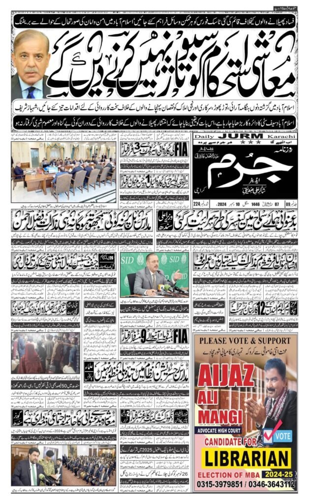 آج مورخہ10 دسمبر 2024 کا روزنامہ جرم کراچی